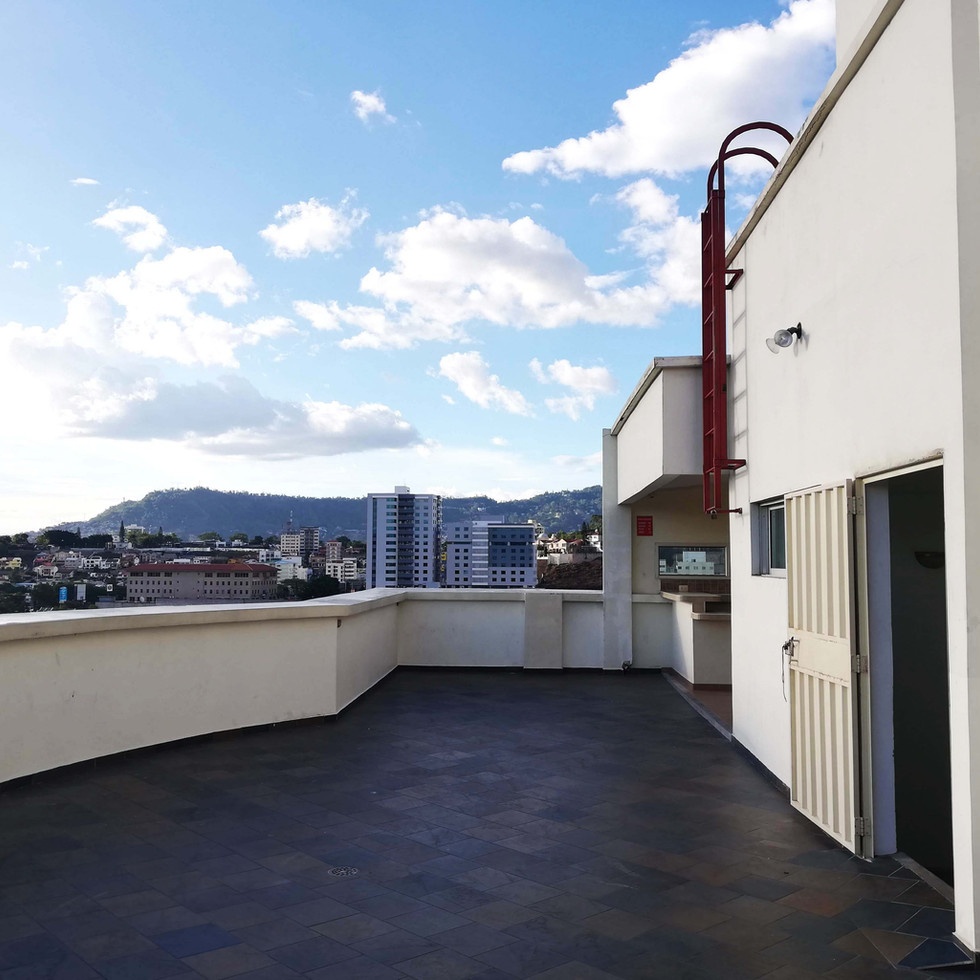 Área social en la azotea con kiosco para hacer barbacoas, amplio espacio abierto para poder acomodar mesas y vistas hermosas de la ciudad.